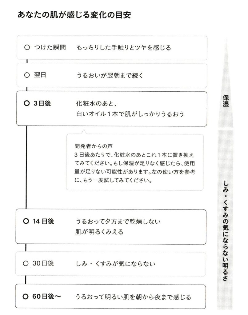 化粧水→美容液→乳液→保湿液の4工程が化粧水→白いオイルの2工程で良いと考えると楽です。