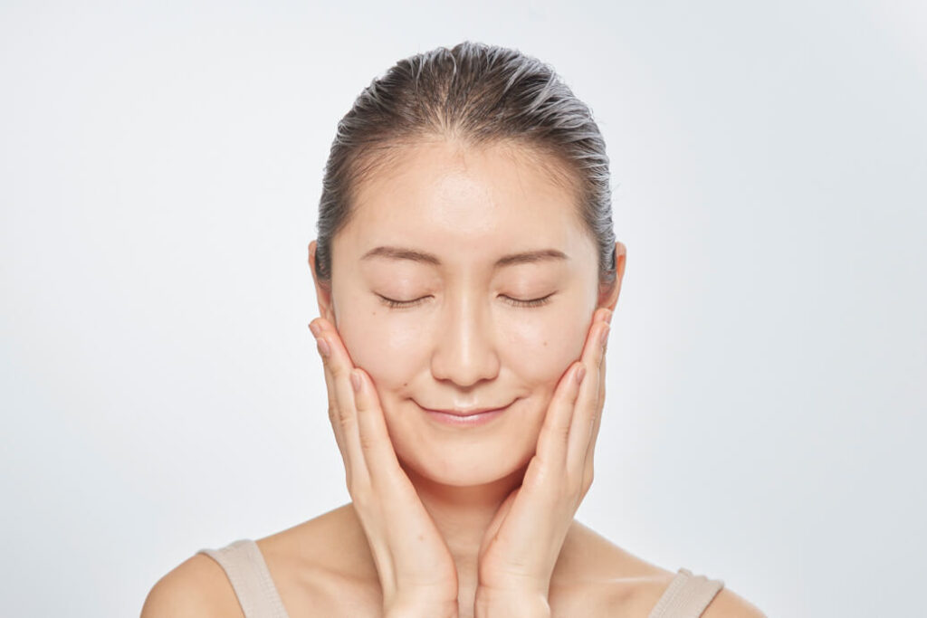 顔の中心から外側に向かって顔全体を包みこむようになじませます。